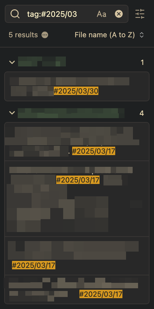 Saya menggunakan format tag tanggal seperti #2025/04/08 dengan backslash (/) sebagai pemisah antara tahun, bulan, dan hari. Format ini memanfaatkan fitur nested tag di Obsidian, sehingga memudahkan pencarian berdasarkan kriteria spesifik—tahun saja, bulan saja, atau kombinasi tertentu.